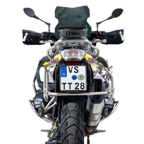 De rechte kant van het BMW Adventure pannier rek biedt directe bevestiging. Aan de uitlaatzijde zorgt deze adapter voor de juiste pasvorm, door de kromming van het originele rek te compenseren.